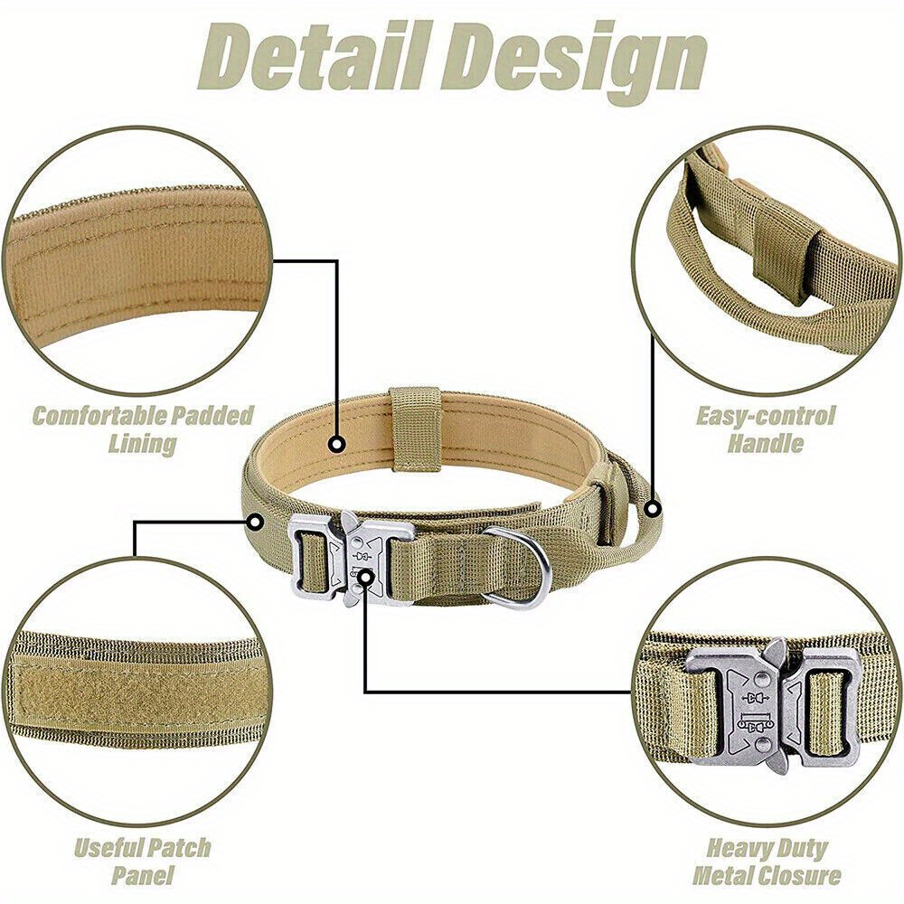 Soft padded lining. While this collar is strong, the padding liner is comfortable. This enables your dog to train, work or explore all day without being distracted by this collar.Controllable Thickened Handle. Control the dog's movements to ensure safety at close range. Thick material, very durable and comfortableSpecification:Product Name: Tactical Dog CollarColor: Green/Black/KhakiMaterial: NylonApplicable objects: General purposeUses: Outdoor trainingWidth: 3.8cm/1.5inchSize: