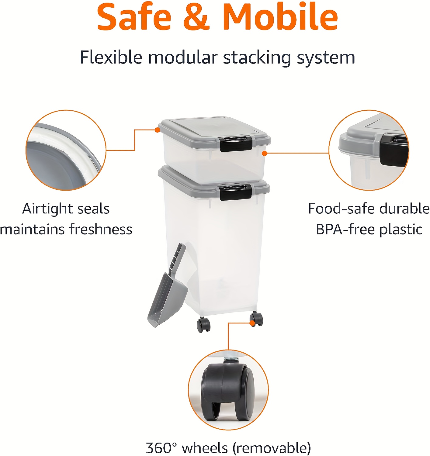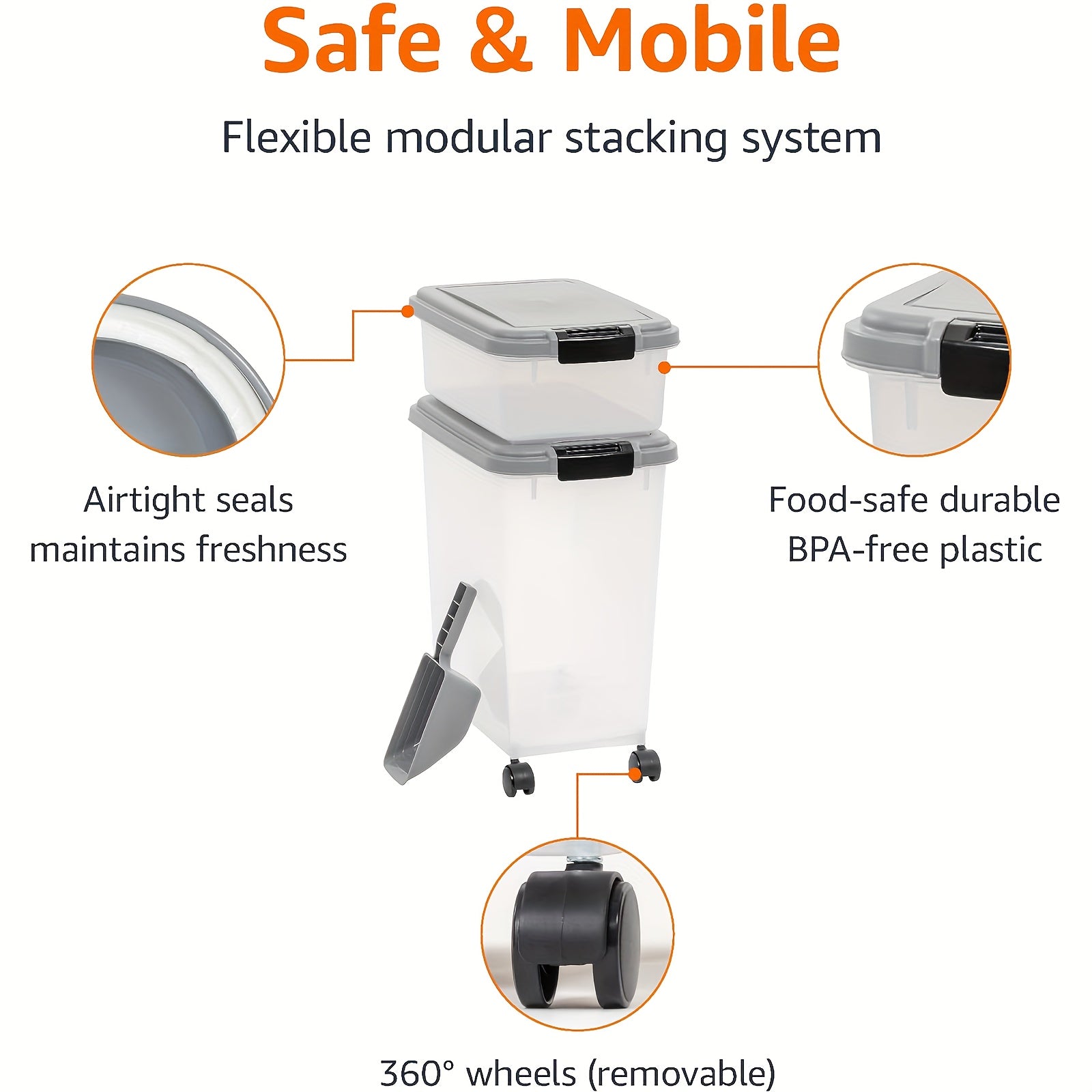 CONTENTS: 11 lbs / 12 Qt storage container securely stacks on the 30 lbs / 33 Qt storage container, one matching 2-cup food scoop, and one set of wheels. Included scoop makes measuring food easy and attachable casters make it easy to roll it around.
