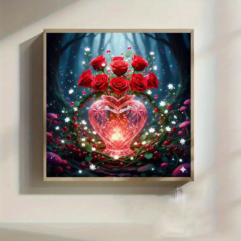 5D Diamond Painting Kit with Glowing Heart-Shaped Diamonds - Magical Forest Night Scene with Glowing Roses & Heart Centerpiece, Round Diamond Mosaic Wall Art Craft with Pre-Cut Table - Frameless for home Decor, Complete Set f