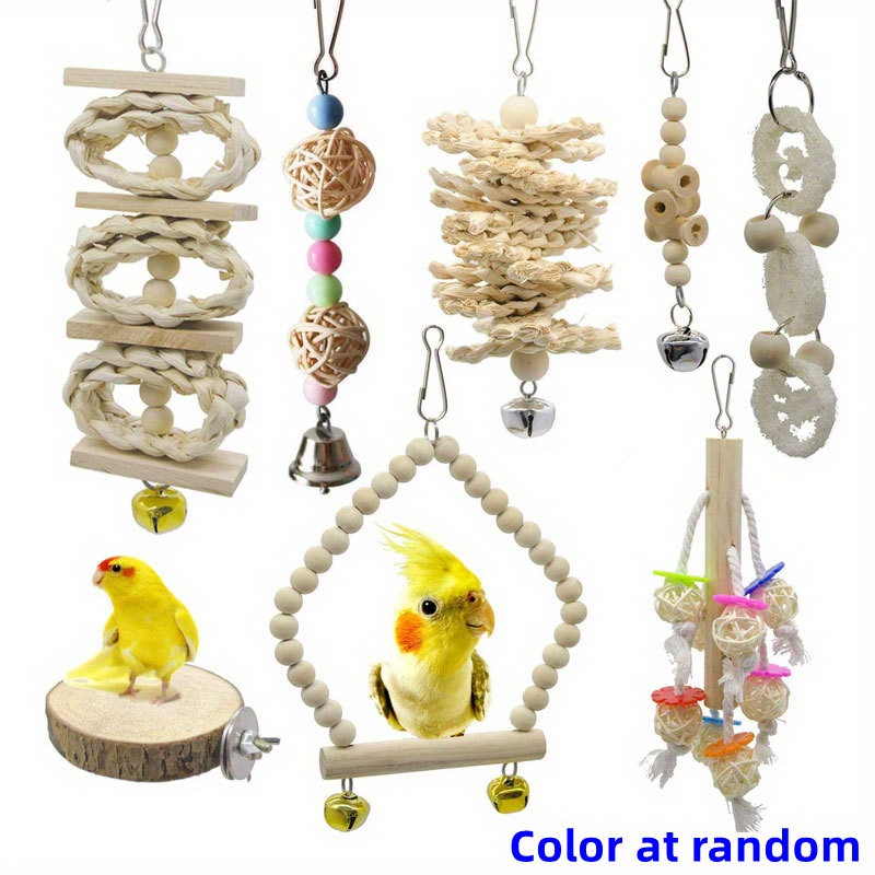 8pcs Wood Bird Toys with Swing, Bell & Chewable Parts - Interactive Bird Cage Suitable for Small Parrots and Birds - Promotes Exercise, Mental Stimulation & Beak