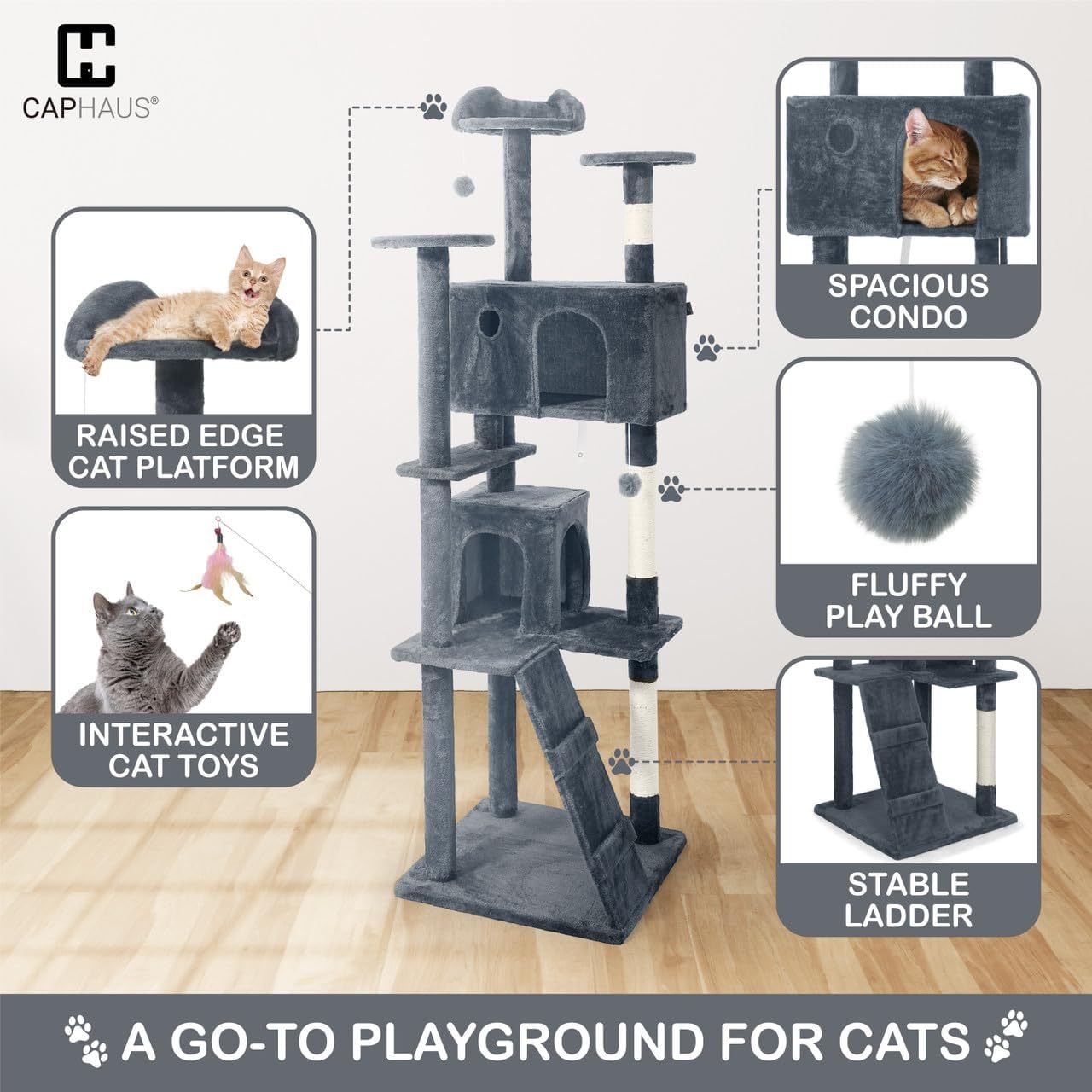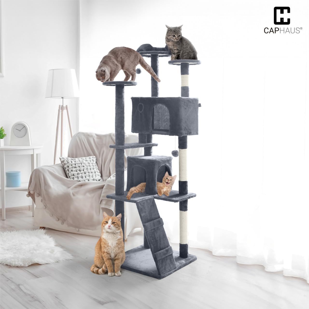 CAPHAUS Cat Tower, 74 Inch Cat Tower for Indoor w/Cat Wand Toy, Modern Cute Cat Tree w/Widened Perch for Large Cats Kittens, Multi-Level Cat Activity Tree w/Scratching Posts, Tunnel, Basket, Cat Cave Condo