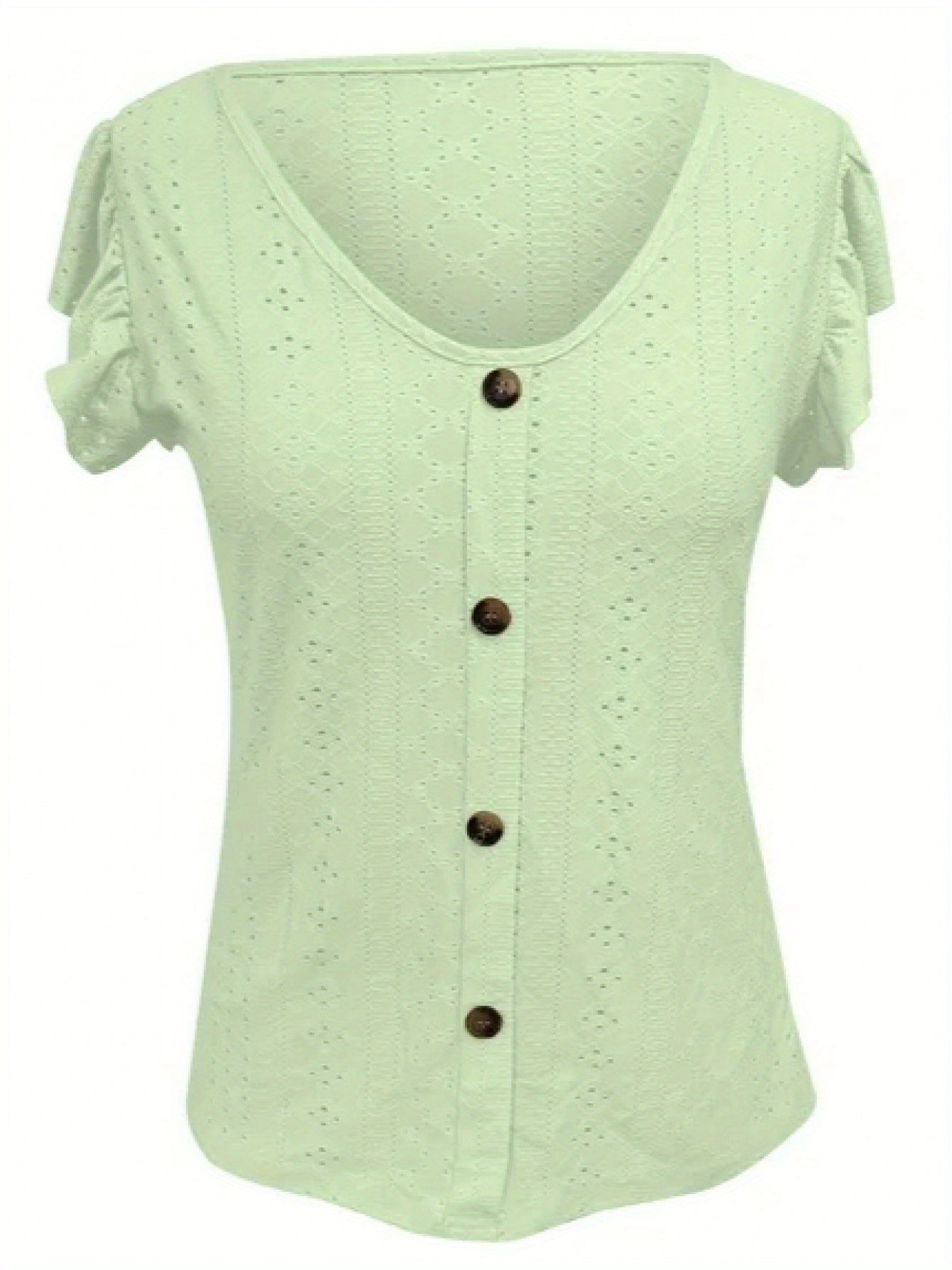 [Elegant Ruffled Top] Elegant Women's V-Neck Ruffled Short Sleeve Top | Eyelet Embroidered Jacquard T-Shirt with Decorative Buttons, Casual Spring & Summer Clothing