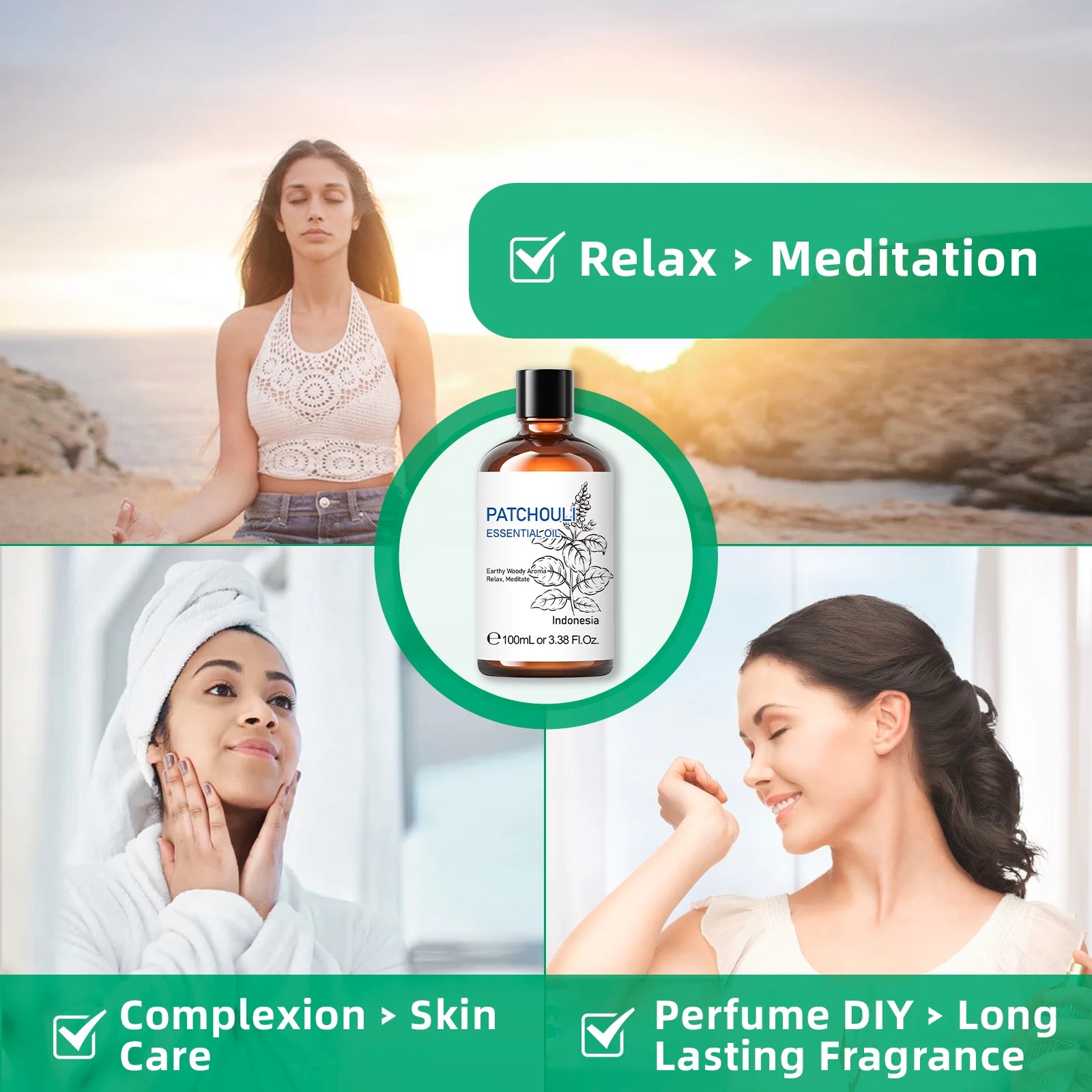 - 100 ml bottle of 100% pure Patchouli essential oil, steam-distilled from leaves (Pogostemon cablin), delivering a rich balsamic aroma and a reliable base-note for blends.