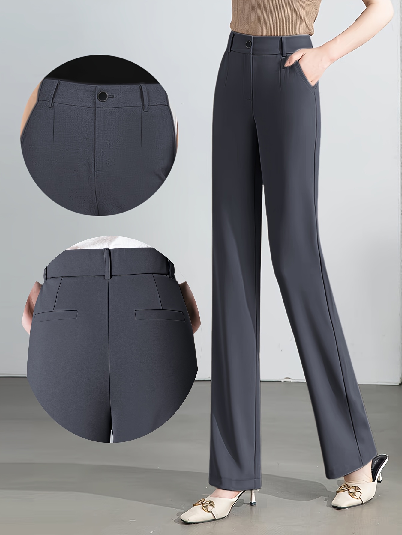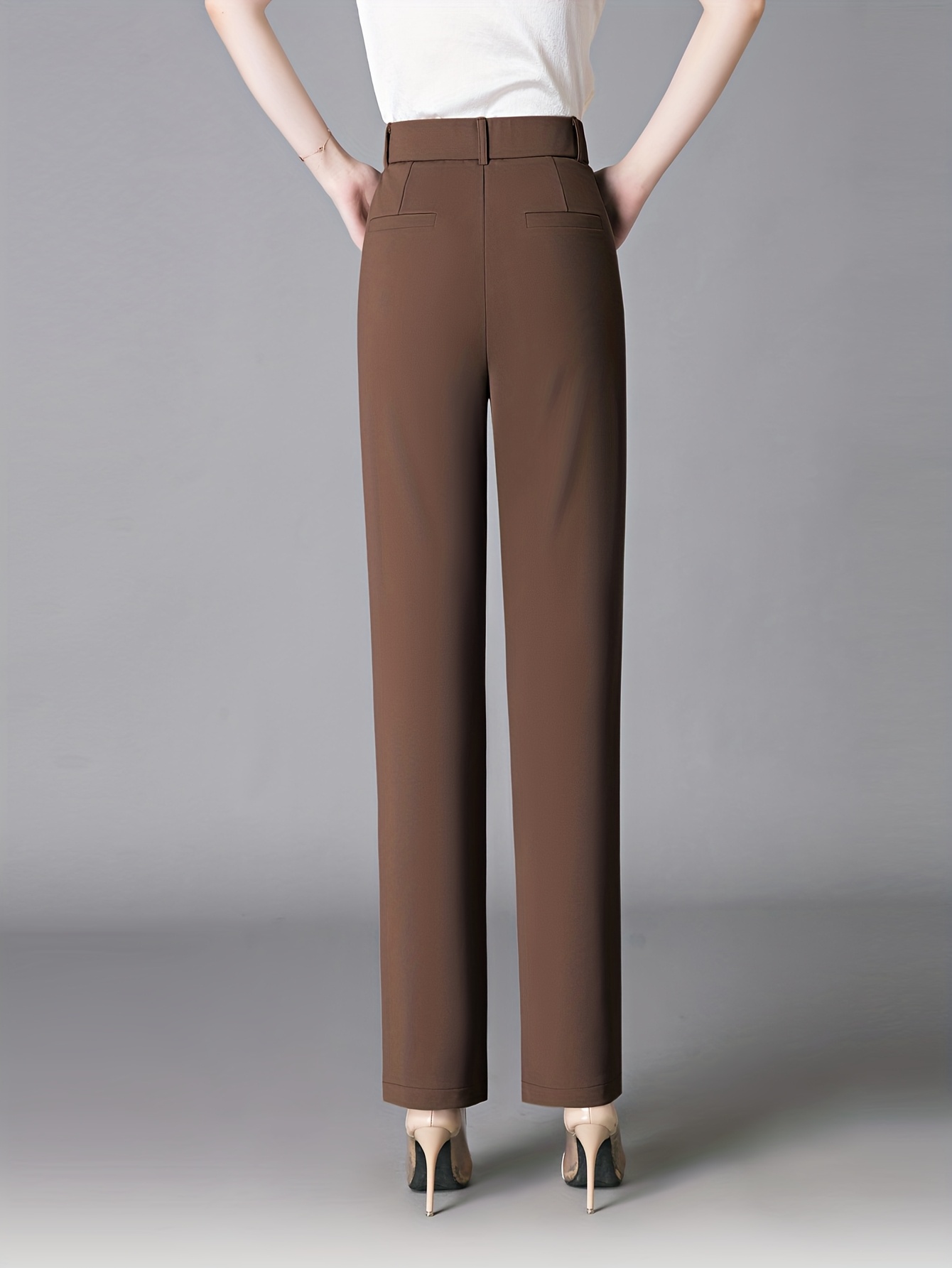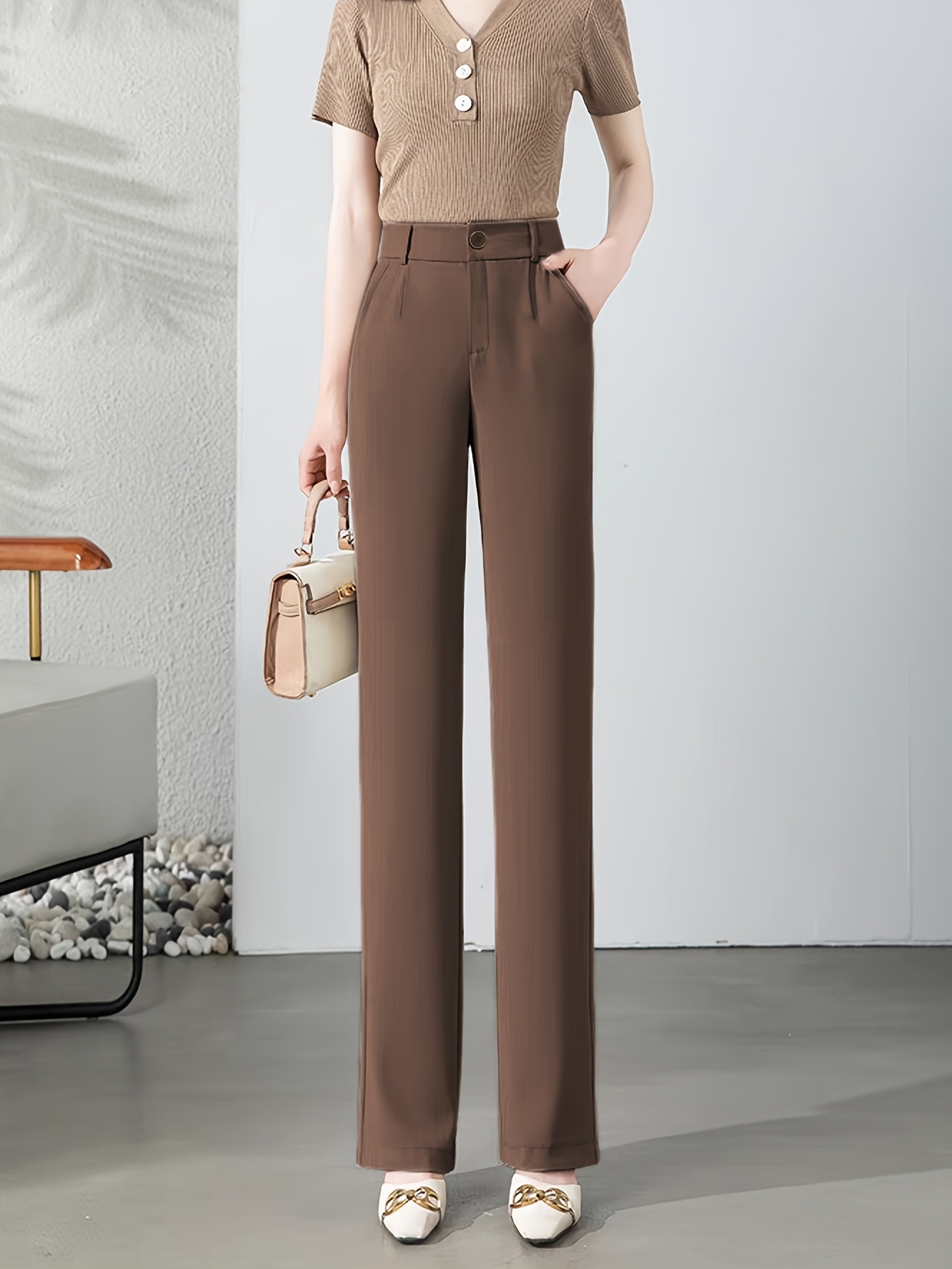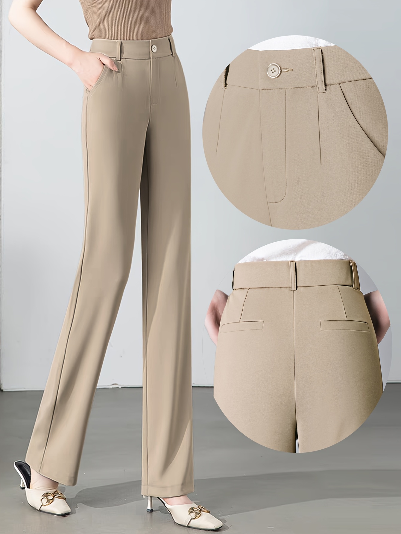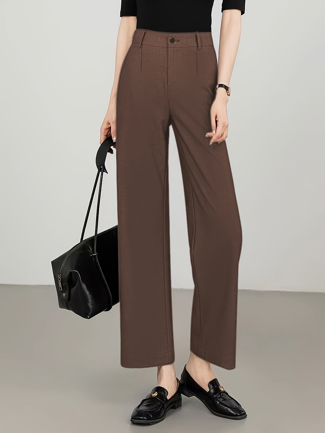 Women'S High-Waisted Slim-Fit Straight-Leg Flared Pants - Elastic Waist with Zipper Closure, Solid Brown Trousers for Work & Casual, Structured Office Pants with Flared Leg, Versatile All-Season Comfort, Easy-Care - Professio