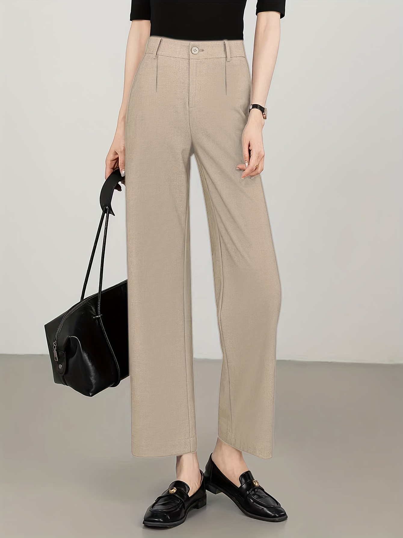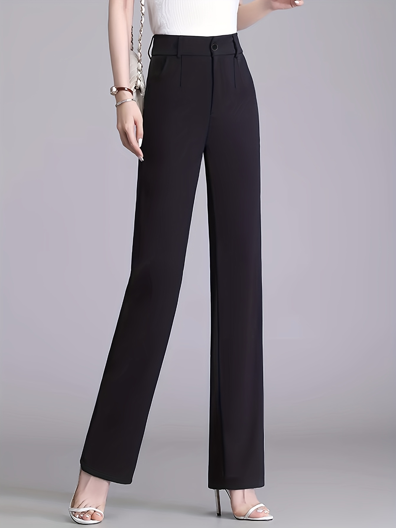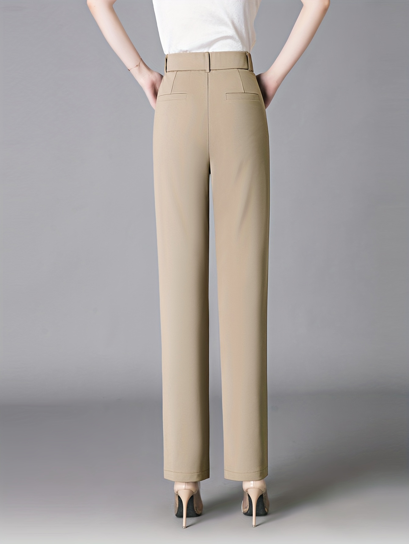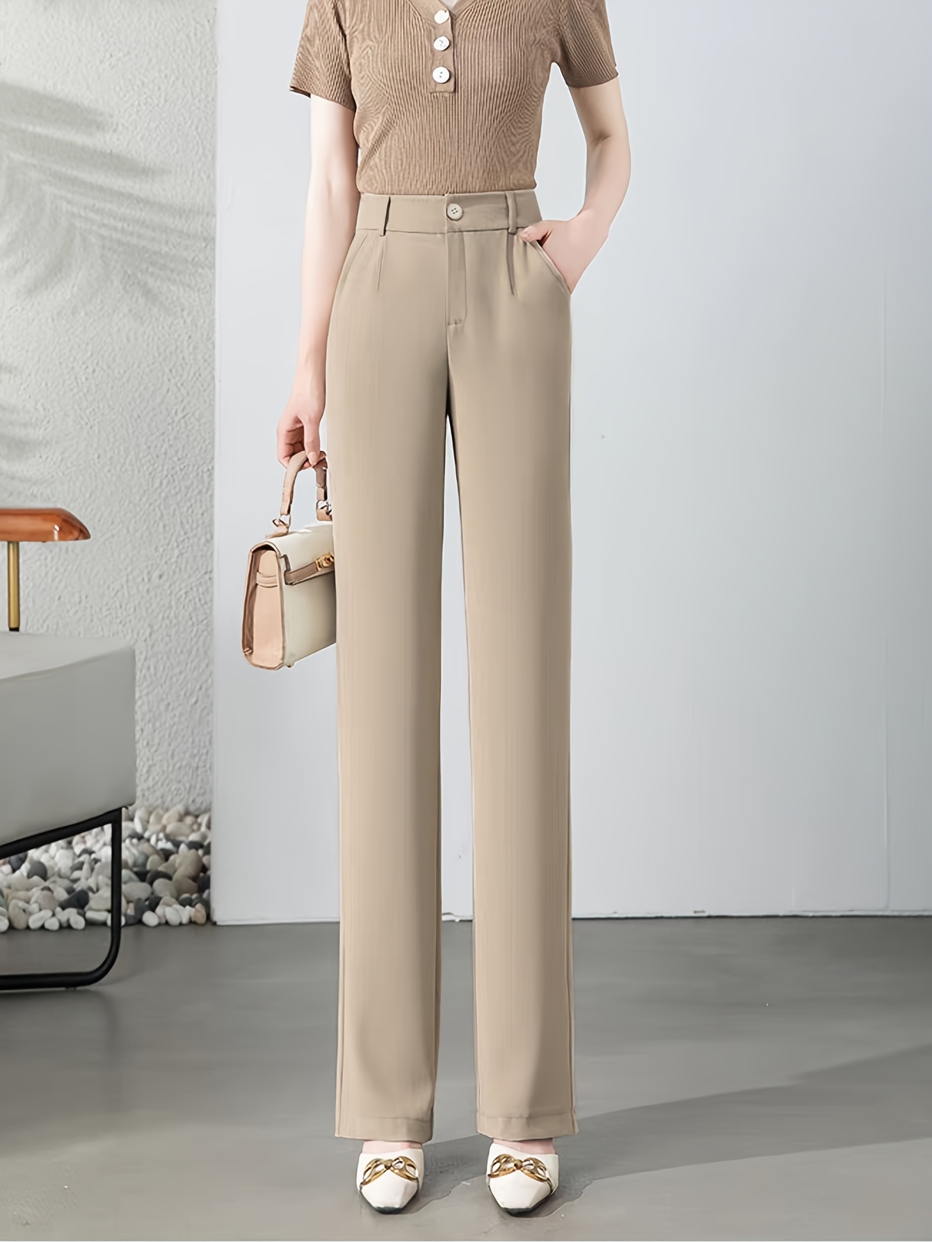 Women'S High-Waisted Slim-Fit Straight-Leg Flared Pants - Elastic Waist with Zipper Closure, Solid Brown Trousers for Work & Casual, Structured Office Pants with Flared Leg, Versatile All-Season Comfort, Easy-Care - Professio