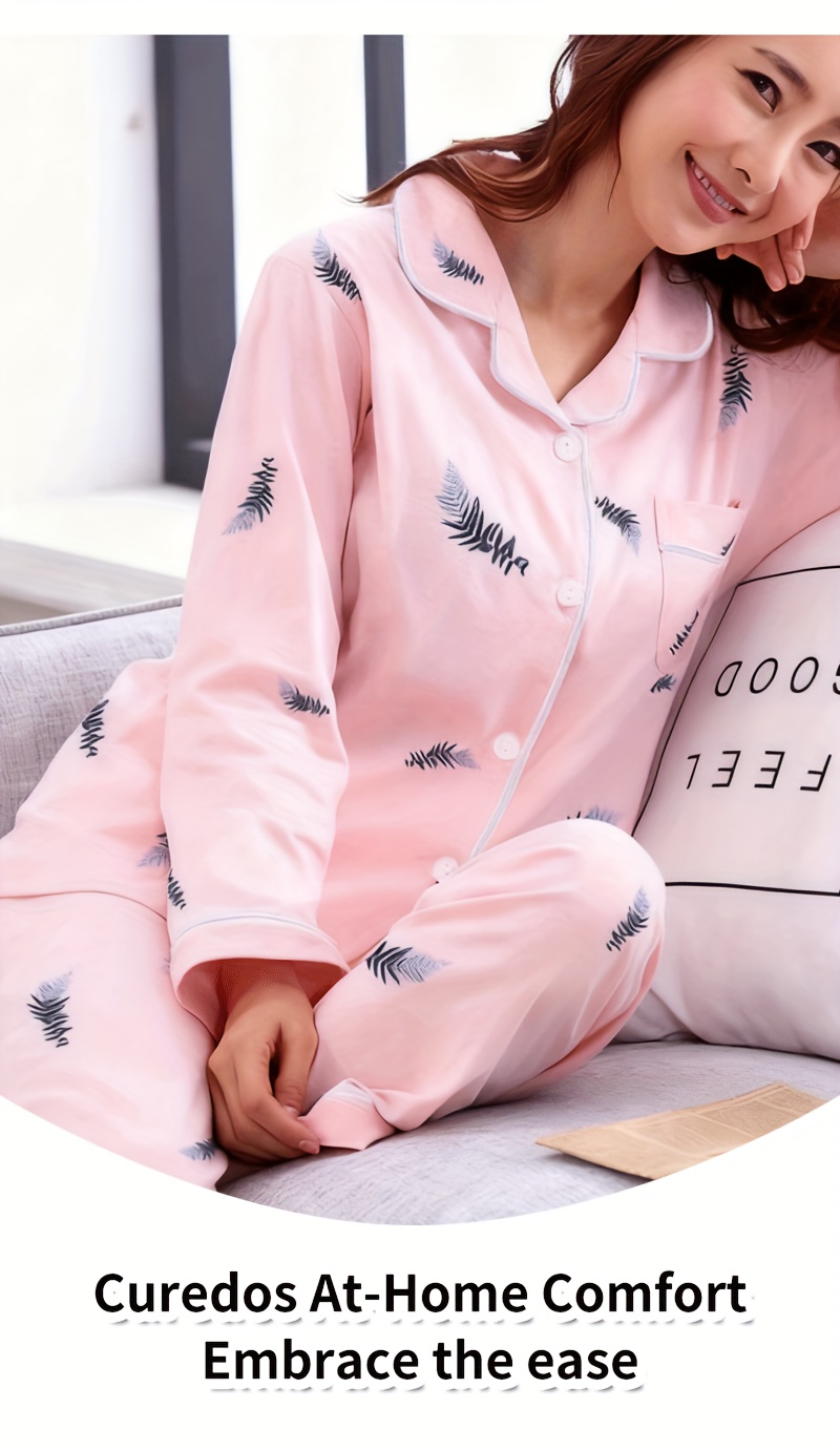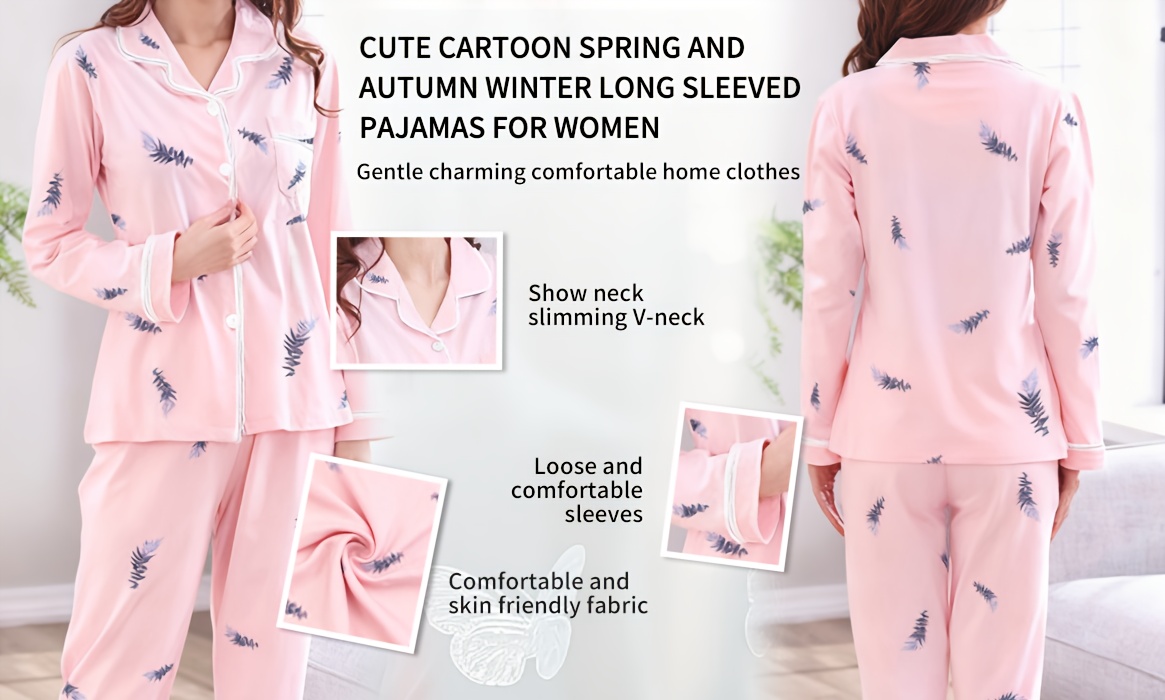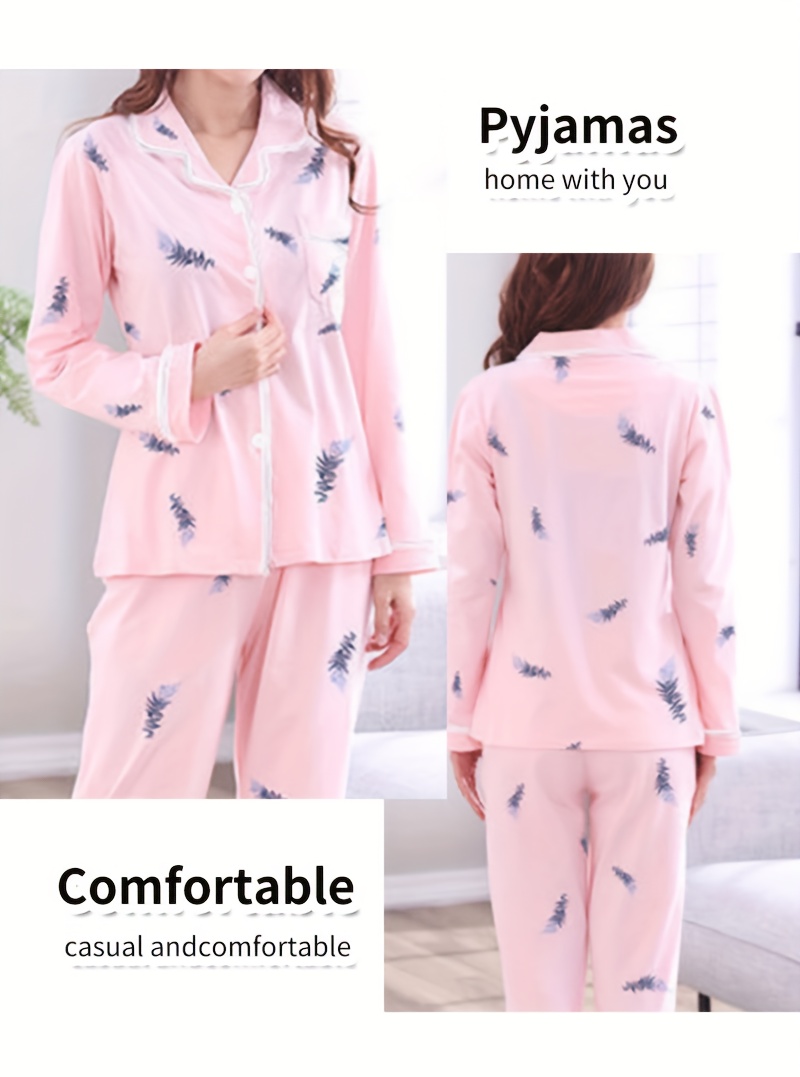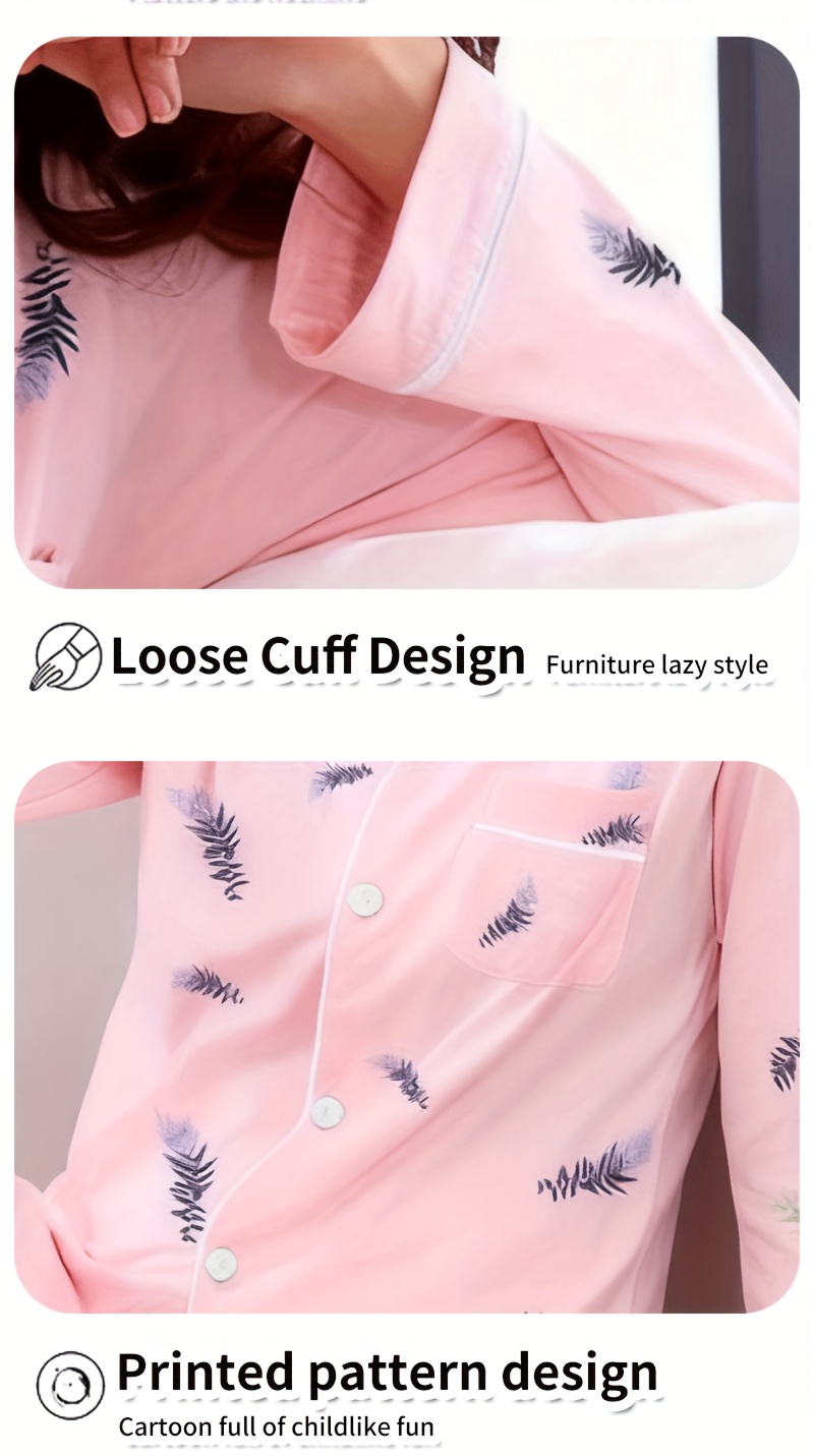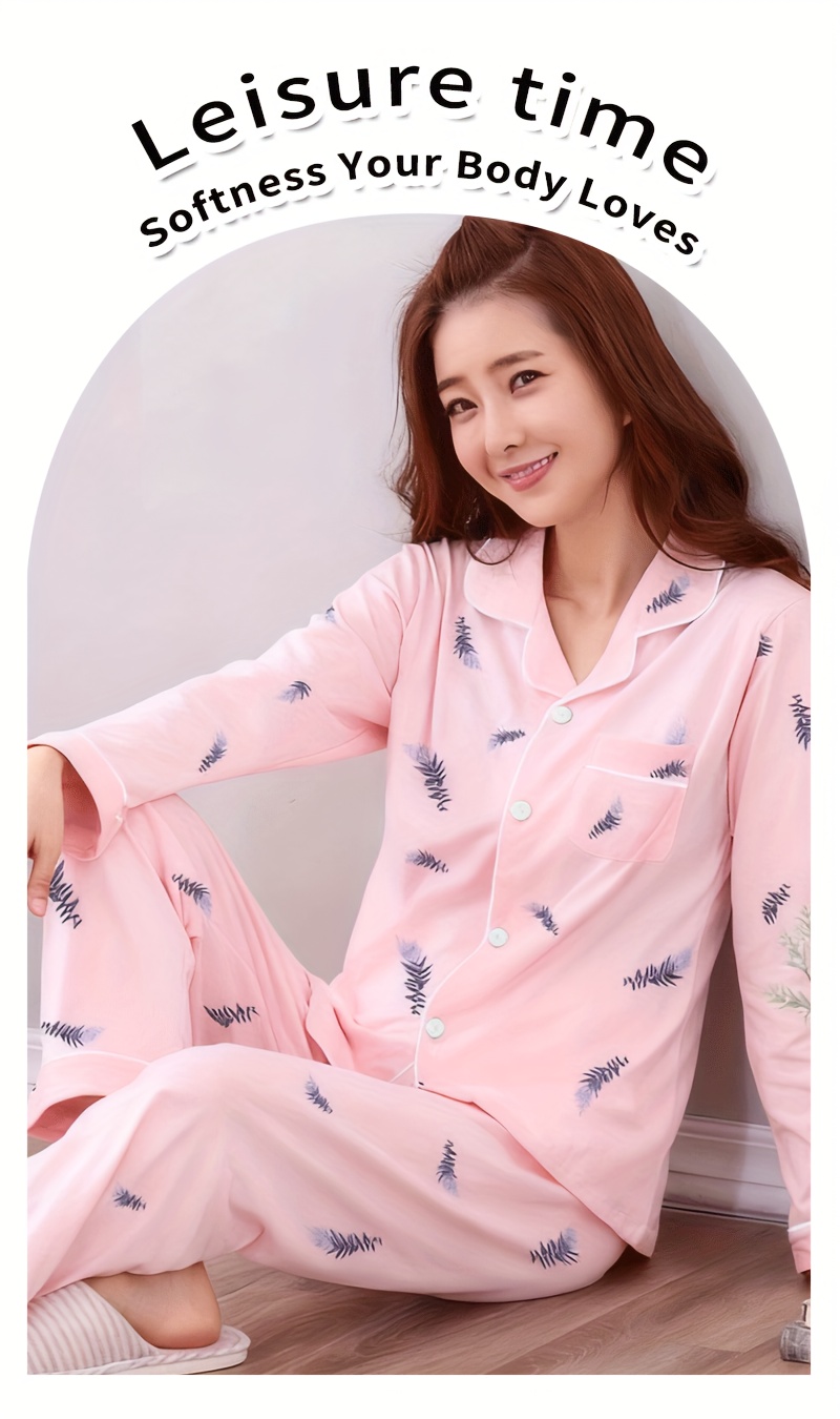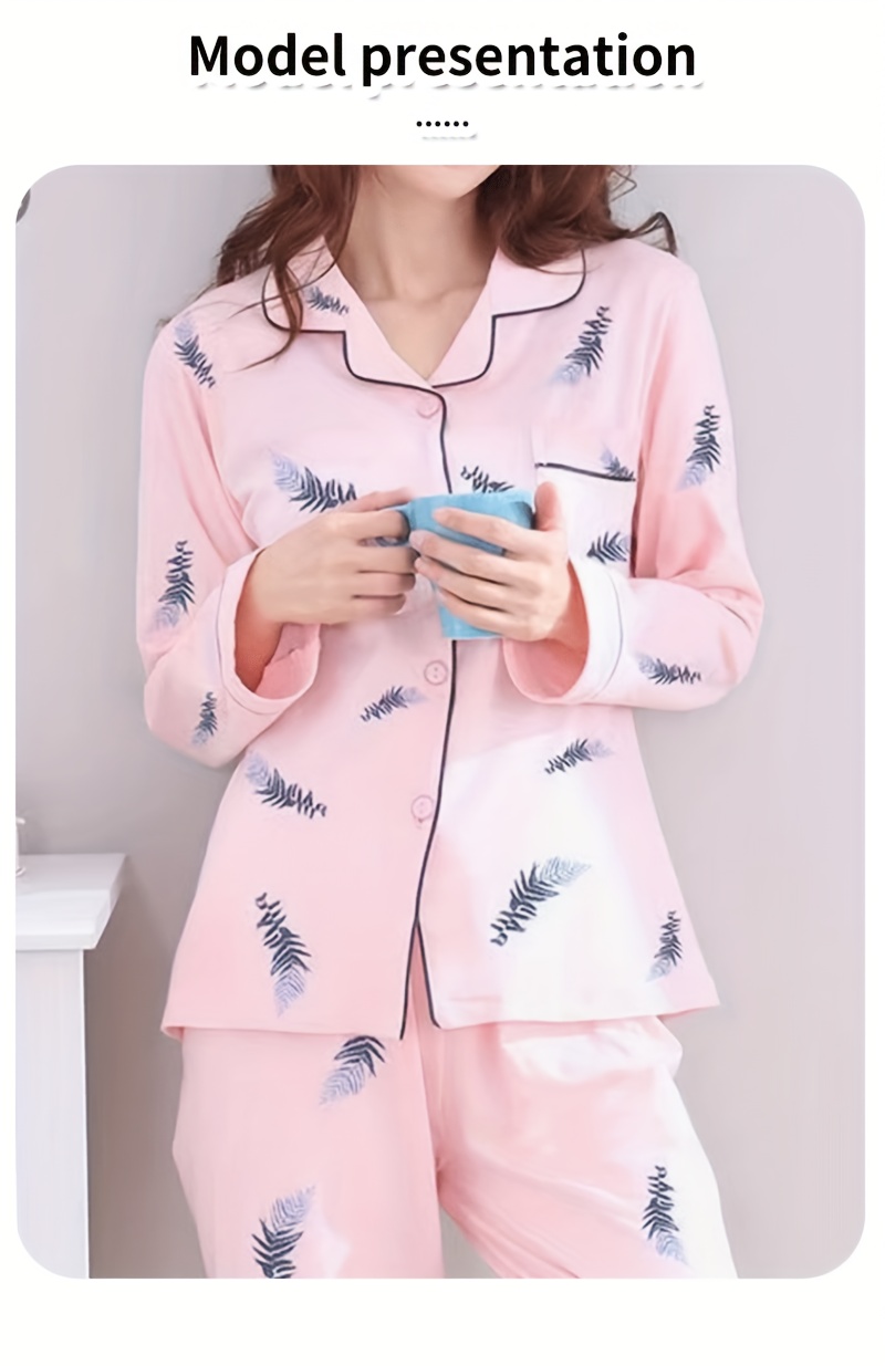 Women's Home Suit Cardigan, Lapel Top, Long Pants Two-piece Set, Natural Patterned Pajamas, Soft and Comfortable Skin Friendly Home Suit Set Without Pilling