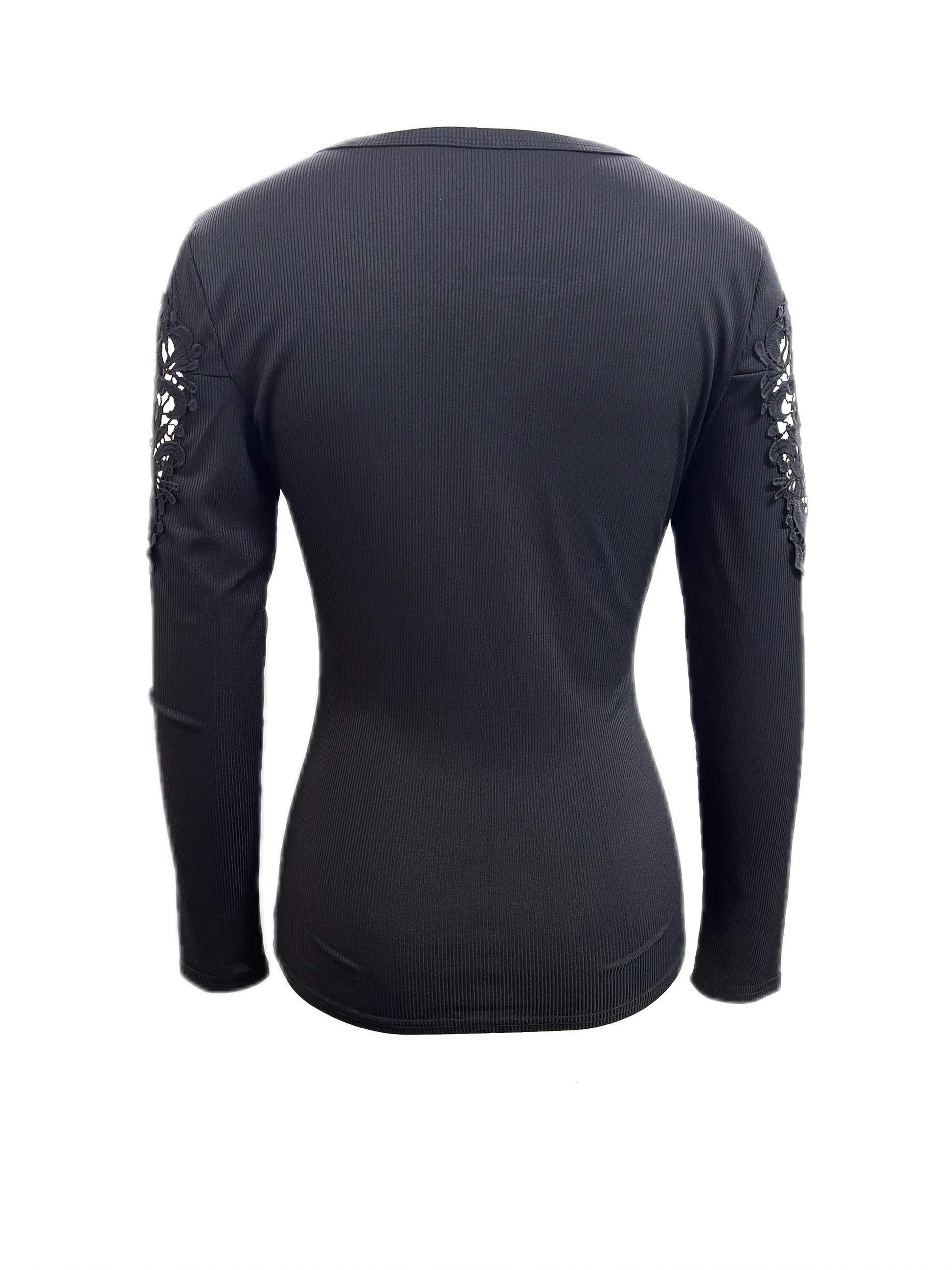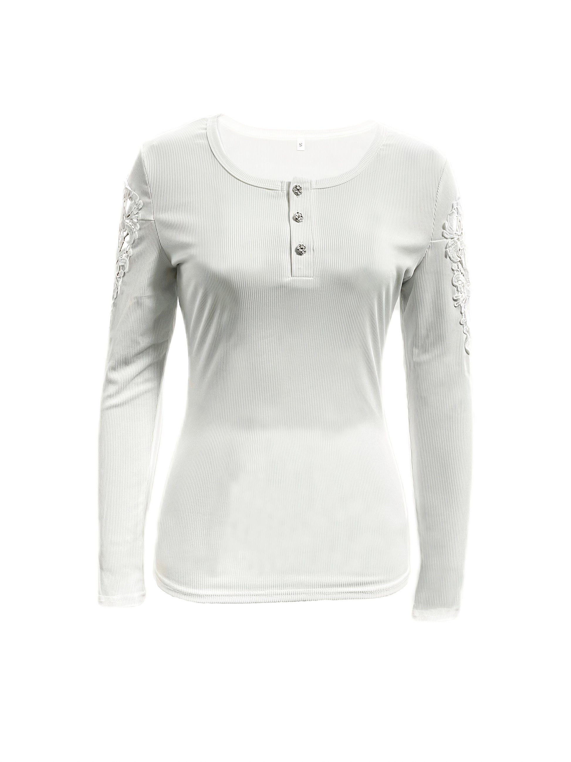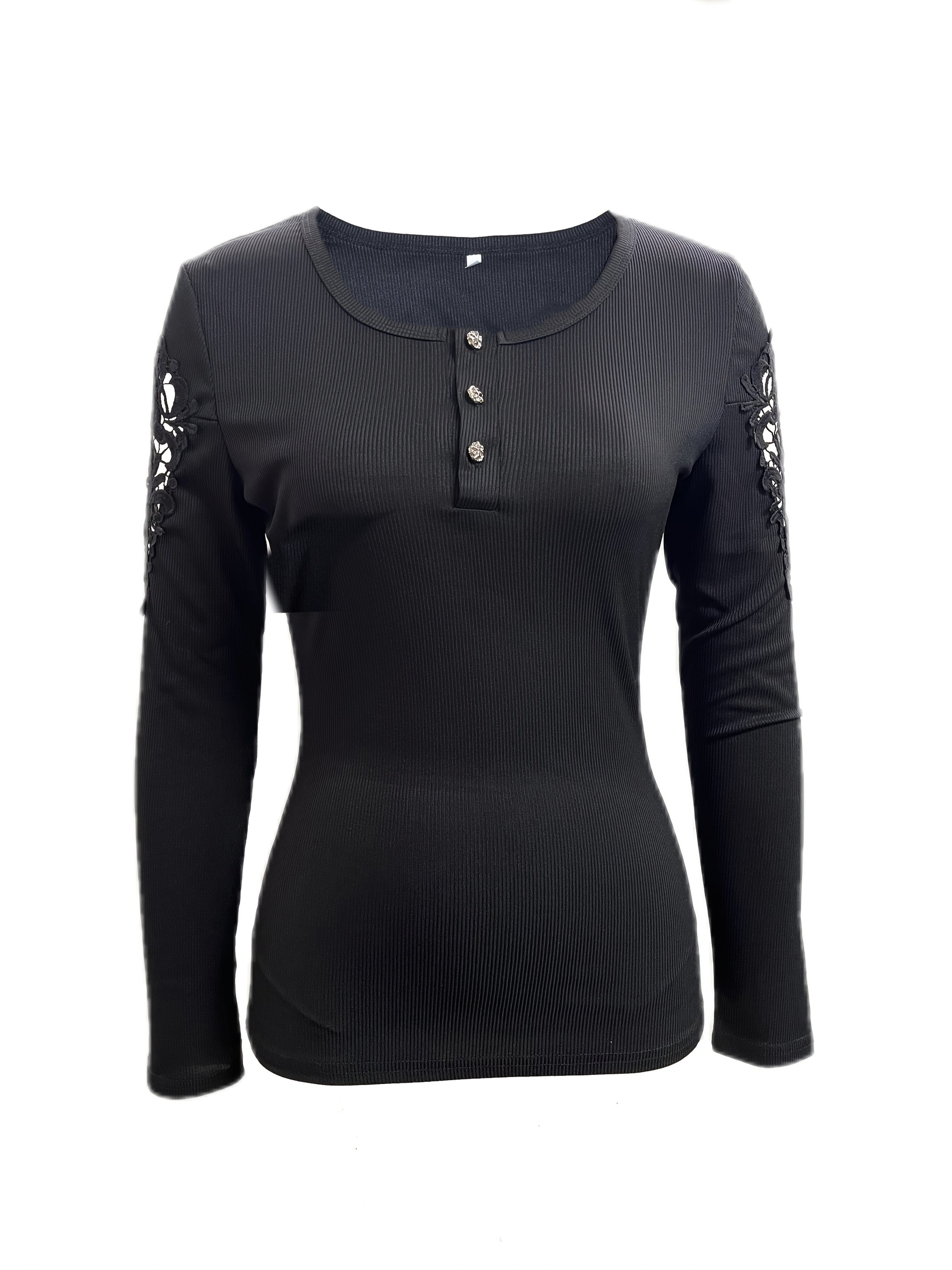 Women's Slim Fit Lace Sleeve Contrast Detail Button-Front T-Shirt - Solid Color Casual Chic Top, Machine Washable All-Season Versatile Wardrobe Staple, Versatile Fashion | Lace Detailed Tee | Quality Stitching, Lace Trim