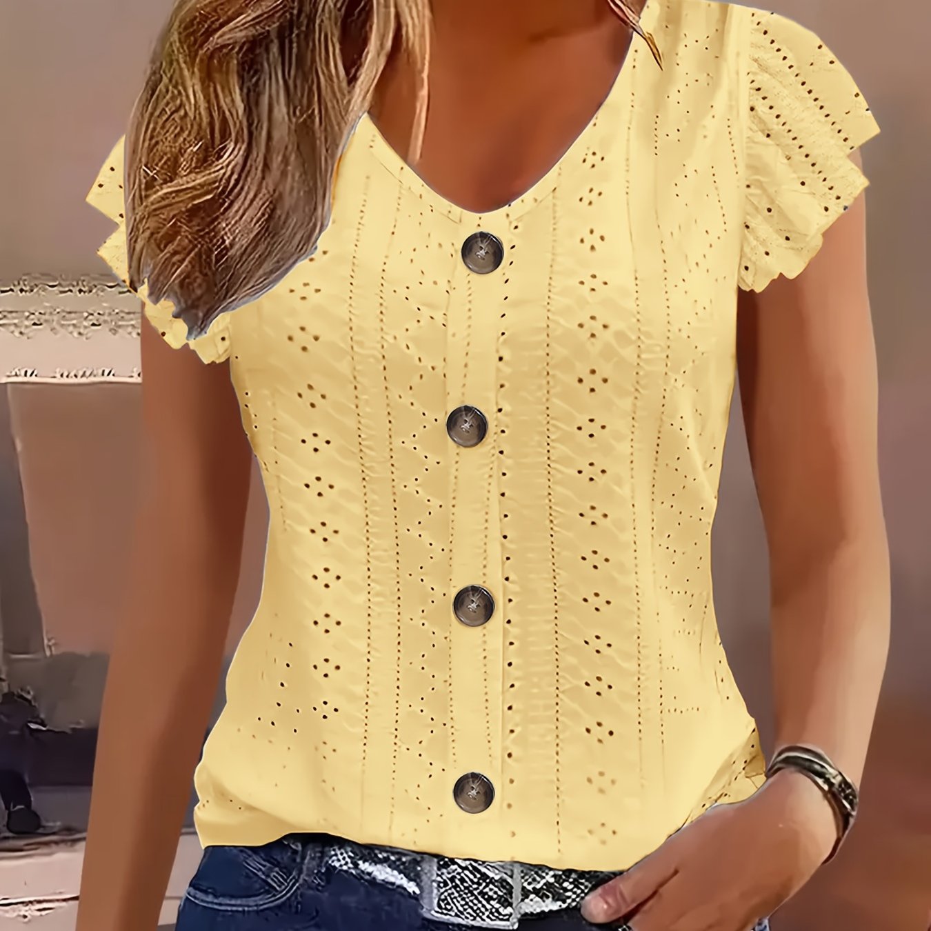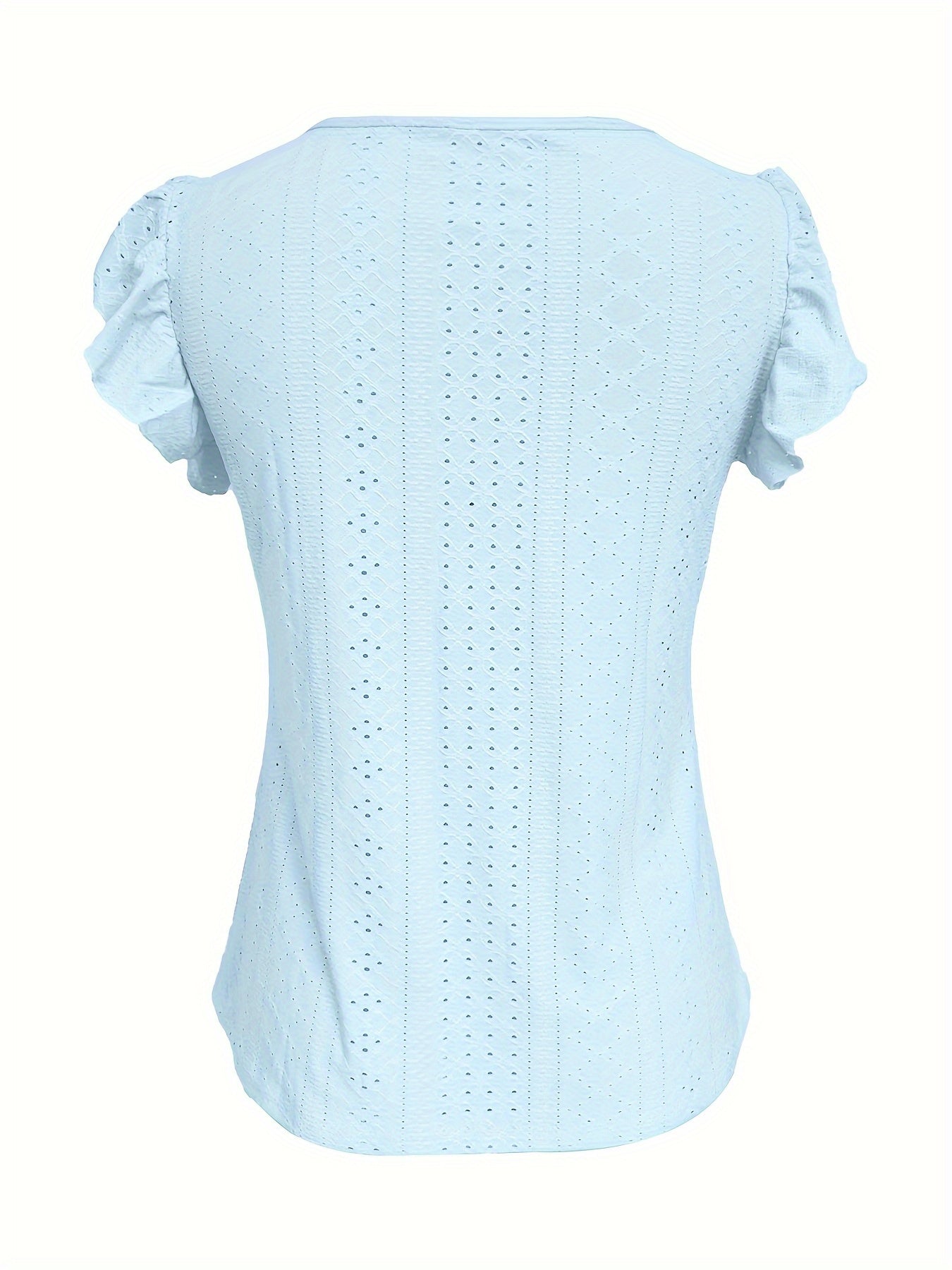 Women'S Solid Colour V-Neck Top with short Sleeves flrared Jacquard t-shirt - Casual Blouse Lightweight & Breathable for Spring/ Summer