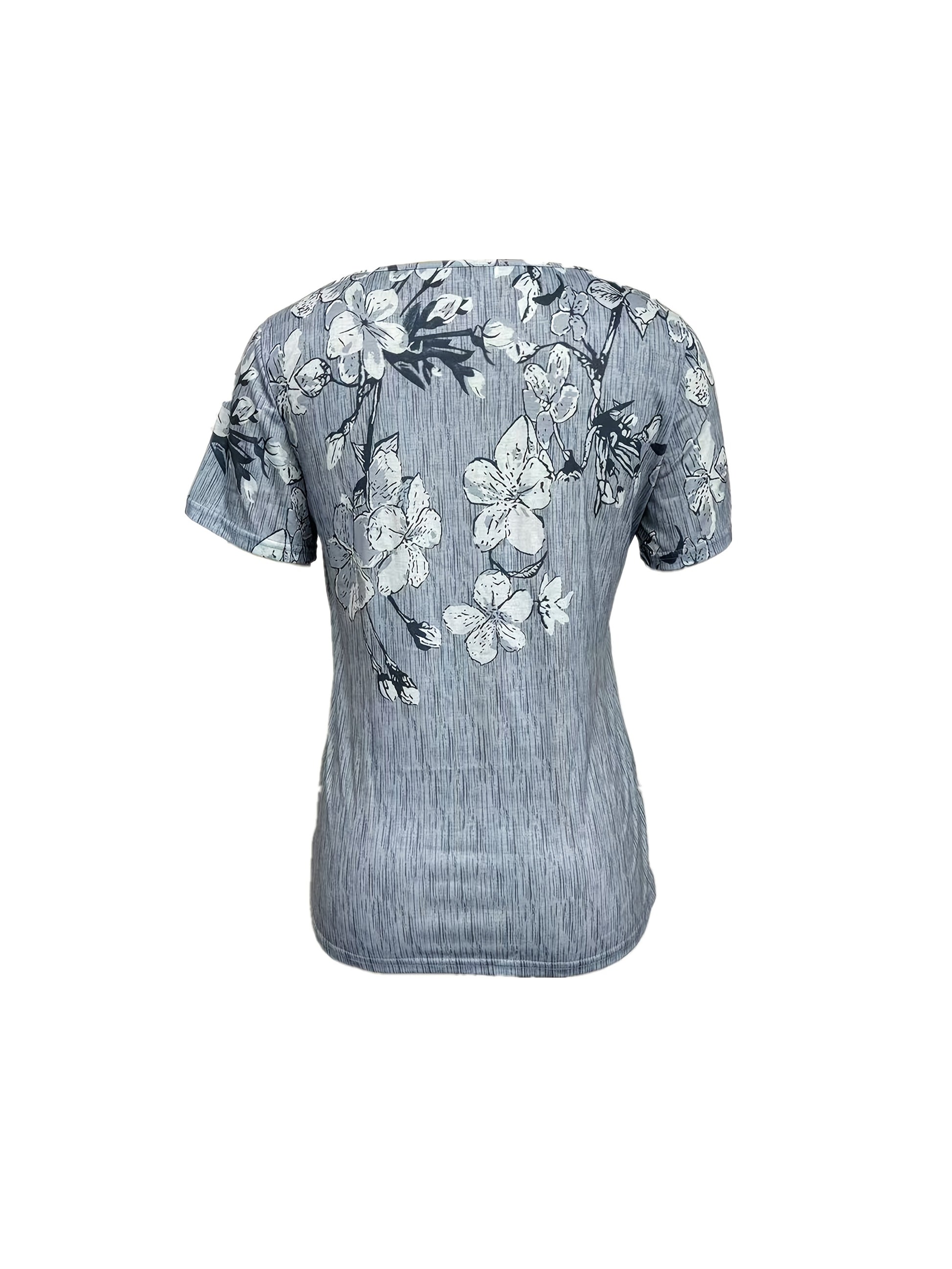 Women's Stretchy Polyester Button-Front V-Neck Blouse - Floral Print Short Sleeve Casual Shirt, Machine Washable Summer Top for Layering & All-Season Wear, Versatile Shirt, Relaxed Fit, Lightweight Fabric, Trendy Style